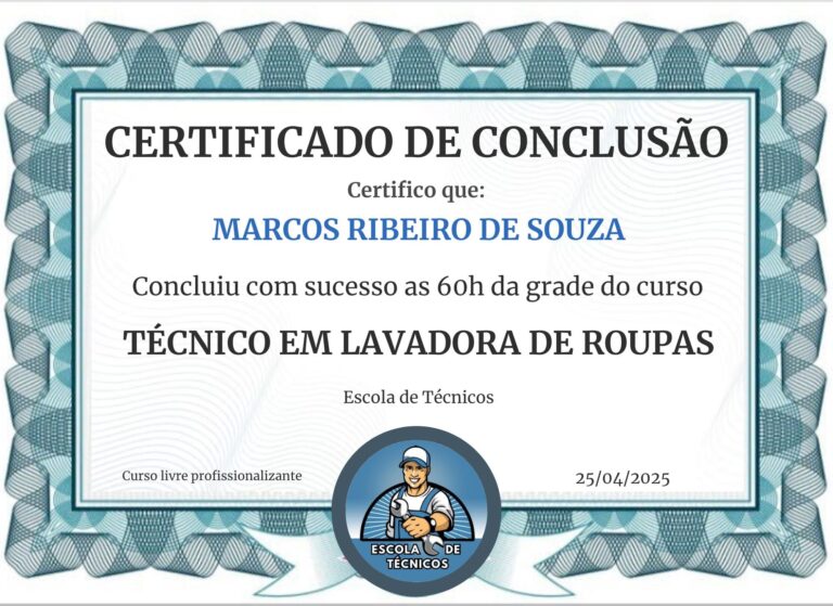 O certificado é a garantia que você fez um ótimo curso e esta apto a exercer a função de técnico em Lavadora de roupas