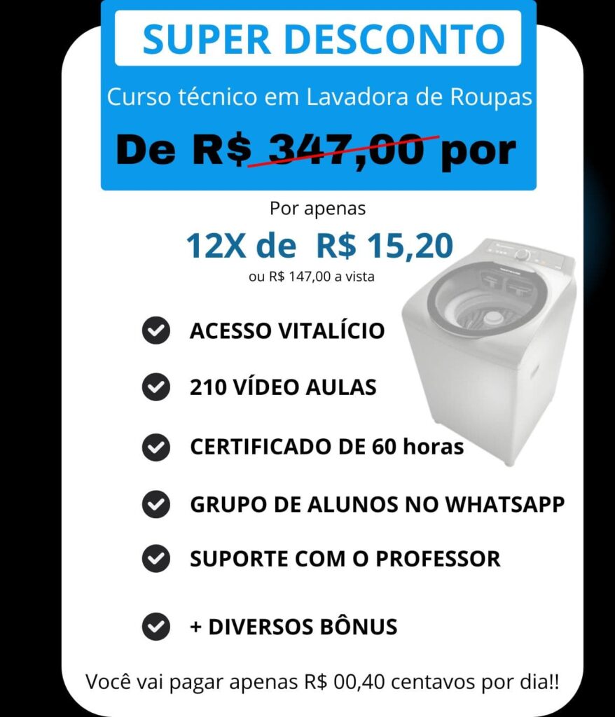 e ainda vai entrar para o curso técnico em lavadora de roupas com 72% de desconto!